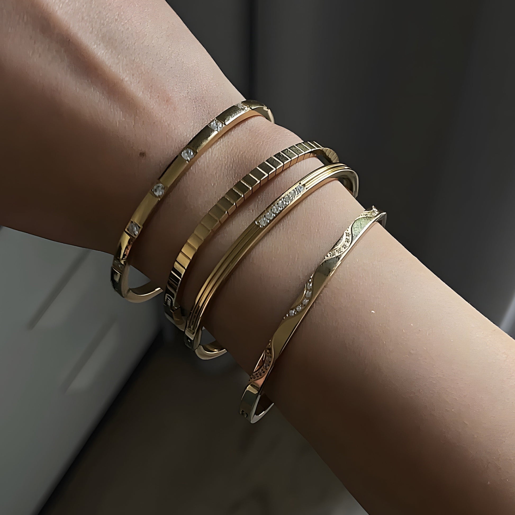 A gold bangle featuring a structured, textured design that adds simplicity and modernity. A standout piece that elevates any wrist stack with a contemporary edge.